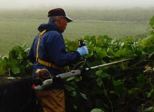 地区内農道の大きな法面の草刈りは大変重労働です。中溝保全会(代表良介さん)では、少しでも皆さんの作業が軽減できればと試行錯誤中です。