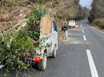 村の幹線道路にせり出した雑木を伐採しました。本来は行政の仕事かもしれませんが、田舎では共助ですね。